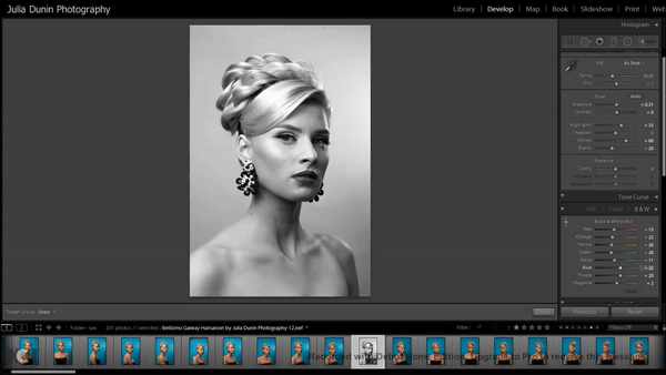 The intense bright blue of the backdrop I used allowed me to change the brightness of the background in Lightroom using the black & white mix tool.